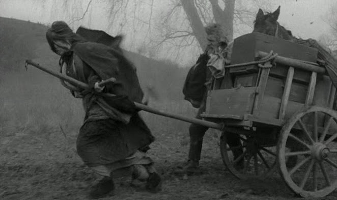 А ще у фільмі можна помітити досить потужні міфологічні образи й мотиви. Вже на початку повернення візника додому подано в майже епічному ключі: напружена музика Міхая Віга, ракурси знизу, що підкреслюють своєрідну монументальність групи, навіть простір – дорога й ліс, вітер і пил, що ховають деталі фігур, майже перетворюючи їх на силуети – візник і кінь тут постають мало не казковими істотами, як такі, що, за повір’ями, возять душі померлих на той світ.