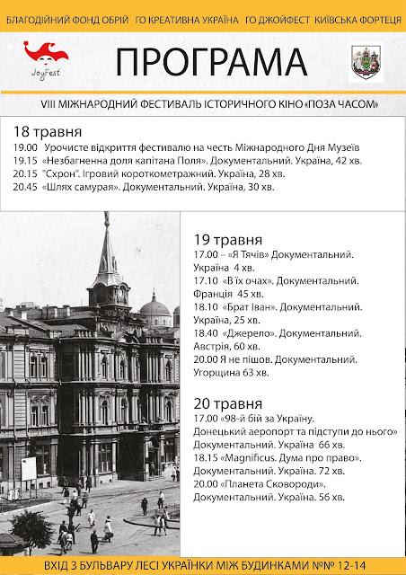 Незабаром в Києві відбудеться дуже цікава подія для усіх любителів кінематографу та історії. З 18-го по 20-те травня в Київській фортеці пройде VIII Міжнародний фестиваль історичного кіно «Поза часом».