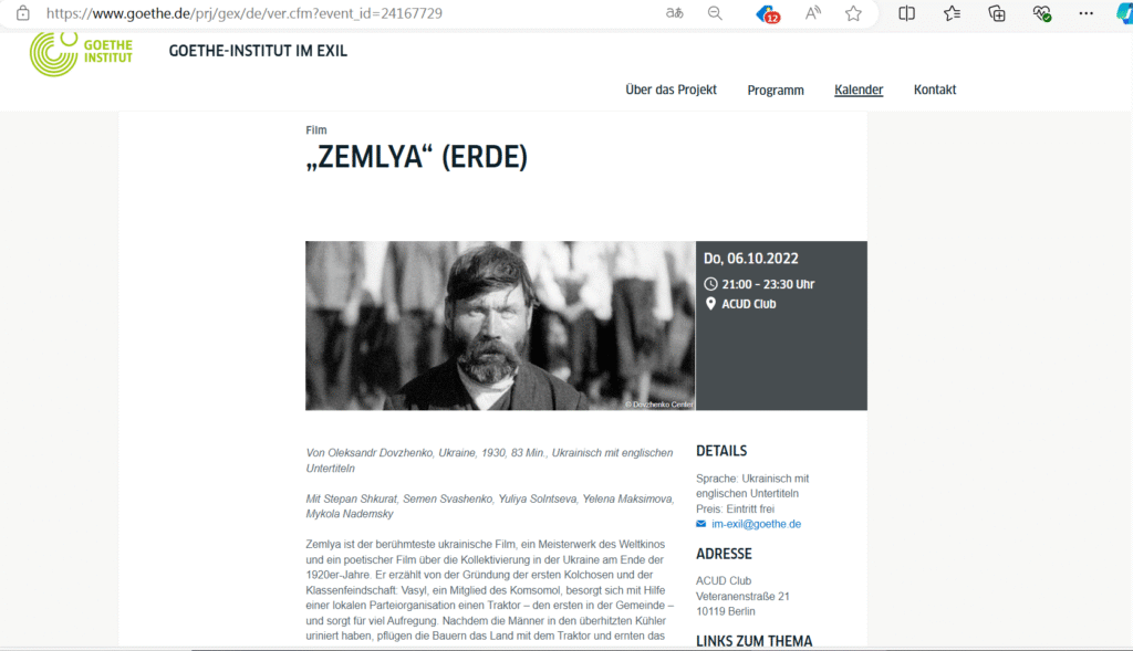 10 RushtonElizabeth. „Arsenal“: Der ukrainische Kino-Klassiker, der seine Wurzeln in Berlin hat. 11.09.2024. https://www.berliner-zeitung.de/kultur-vergnuegen/arsenal-der-ukrainische-kino-klassiker-der-seine-wurzeln-in-berlin-hat-li.2252945; Boehme Tim Caspar. Wie man zum Lokführer wird. 17. 9. 2024. https://taz.de/Sowjet-Filmklassiker-Arsenal/!6033886/