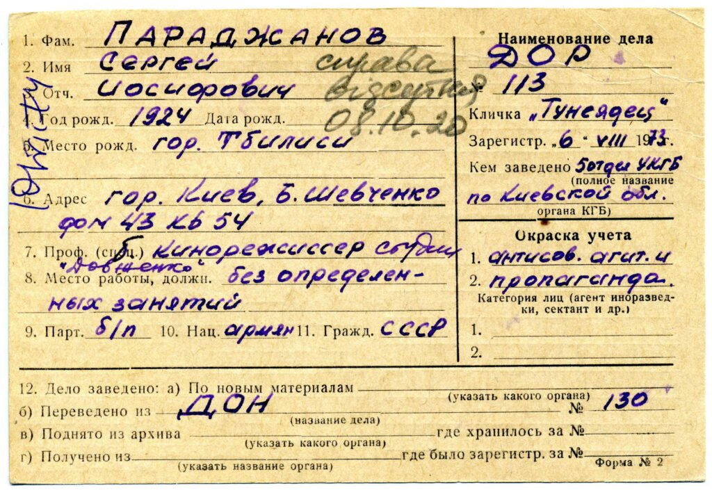 На режисера стало звертати увагу КДБ. У складеній на митця довідці, наприклад, поруч із перерахуванням низки його “випадів проти влади”, зокрема в розмовах з іноземцями, вказано ще інший, особливо важливий для нас момент: «ПАРАДЖАНОВ підтримує зв’язки з націоналістично налаштованими елементами, зокрема, з ДЗЮБОЮ, ХОЛОДНИМ та іншими, які намагаються використати його у своїх задумах в плані популяризації націоналістичних ідей у кіномистецтві”. Мабуть, найповніше його особистість в очах влади характеризує висновок: “Багато хто з працівників студії характеризує його як морально розкладену особистість, яка перетворила свою квартиру на місце збіговиськ різного роду сумнівних осіб, які займаються пияцтвом, розпустою, спекуляцією, політично шкідливими, а часом і антирадянськими розмовами”11.