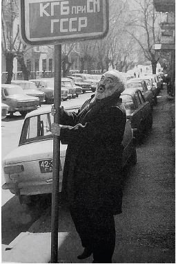 Параджанов був схильний до епатажу, і епатаж цей нерідко набував ризикованих форм. Його презирство до формалізованості, якою так відзначалося радянське життя, знайшло прояв в “інтер’єрі” туалету в його знаменитому будинку в Тбілісі (або, як він по-вірменському називав його, “Тифлісі”). Збереглися спогади про цей “інтер’єр”, така собі іронічна картина режисерського минулого на тлі сталінської доби: “На стінах кнопками були прикріплені всі його документи – атестат школи, і диплом ВДІКу, і довідка про те, що він провчився рік в інституті залізничного транспорту, і довідка про те, що два роки провчився в Тбіліській консерваторії на вокальному факультеті, і музичні грамоти, і почесні грамоти про воєнно-шефську діяльність, і зі всіх аркушів на нас дивилися Ленін і Сталін, а іноді тільки Ленін. Своїх гостей він намагався особисто супроводити в туалет. На невеликій тумбі стояла порцелянова велика ваза, в ній була вода, ваза вся була в глазурі і на ній портрети Сталіна і Мао Цзедуна з написом: “Москва-Пекин-Дружба””4. У цьому переліку насмішка над майже ритуальним у радянській системі ставленням до документів по суті переходить у критику культу особистості – але втілено це артистично і з гумором. Такі жарти на межі були в нього непоодинокими – досить згадати фото, в якому режисер жартівливо схопився за знак біля будівлі КДБ у Тбілісі. Характерний спогад зберігся і стосовно українського періоду Параджанова: якось по всій висоті будівлі, де знаходилася його київська квартира, розмістили величезний портрет-плакат Л. Брежнева. Митець вирізав одне око Брежнєва і в отвір став махати демонстрантам. Демонстранти цей епатажний перформанс – “ожиле” око Брежнєва – сприйняли з ентузіазмом, а працівникам КДБ С. Параджанов пояснив: “Я не знущаюсь ні над ким – просто дивлюся на парад трудящих оком Леоніда Ілліча Брежнєва”5. Подібних анекдотів у спогадах про Параджанова безліч; сьогодні важко вже сказати, що з них правда, а що вигадка – тим більше, що сам митець із задоволенням “розводив” міфи про себе – але це не так і важливо. Головне, що всі ці історії стали невід’ємною складовою параджанівського міфу, породжені його особистістю, і чималою мірою через їхню призму він і сприймався – друзями, шанувальниками і… каральними органами. Артистична, внутрішньо вільна людина випадала з радянського способу мислення й життя сама і вже самим своїм існуванням провокувала “випадати” й інших.